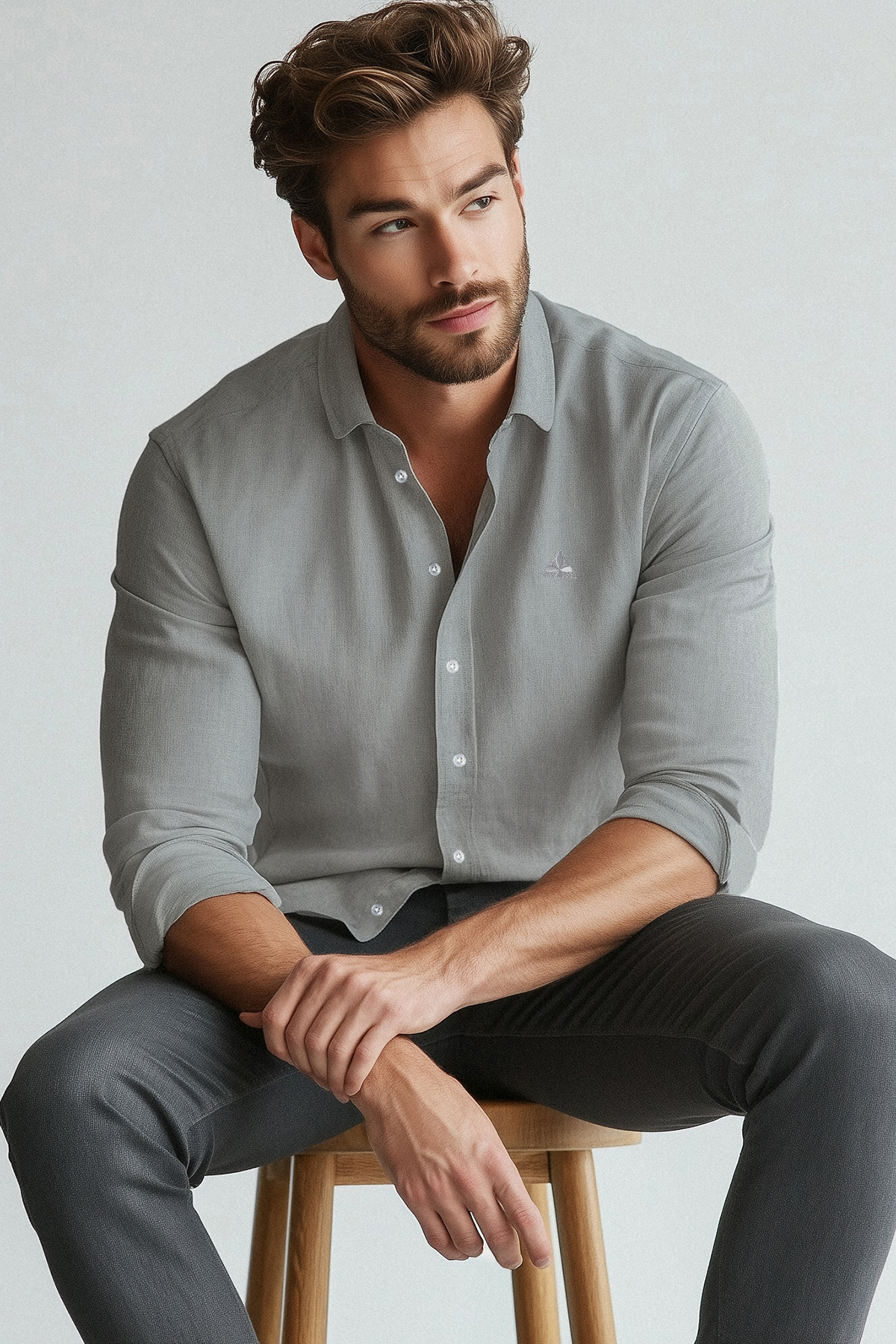پیراهن مردانه کتانی تابستانی با یقه باز طوسی TRENDYOL MAN
