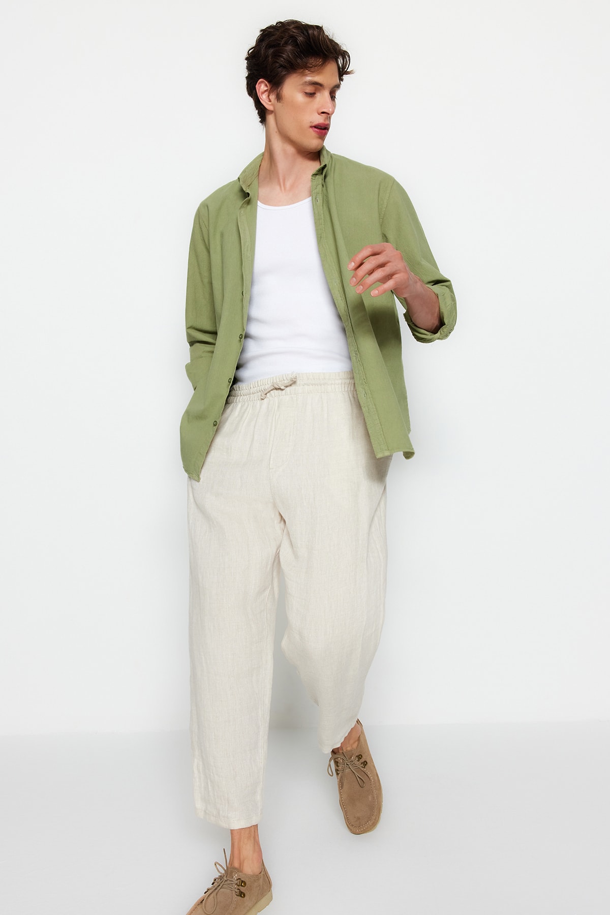 پیراهن مردانه کتانی 100% نخی خاکی رنگ trendyolmilla man