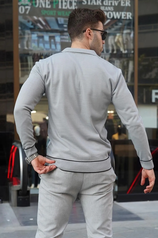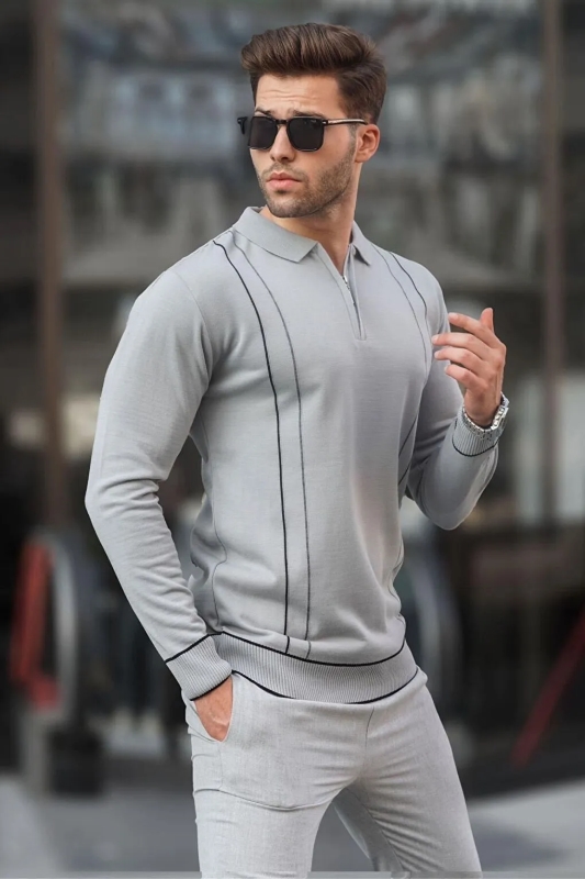 پلیور بافتنی مردانه یقه پولو زیپ دار MADMEXT طوسی
