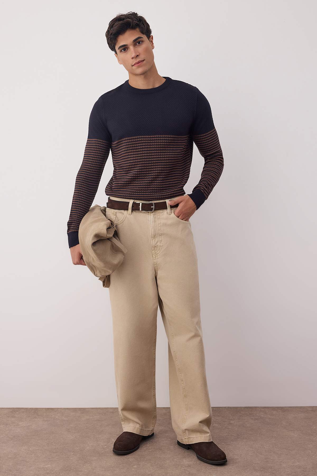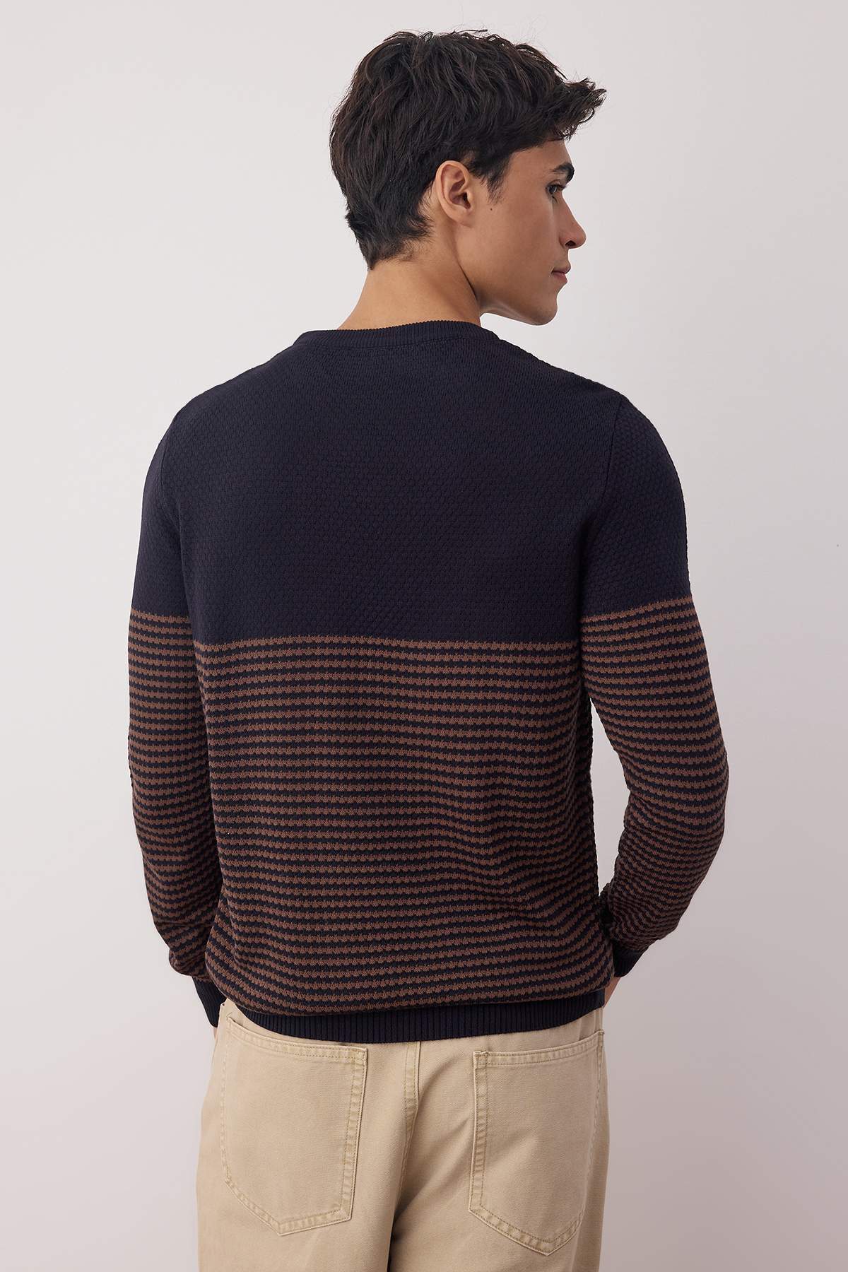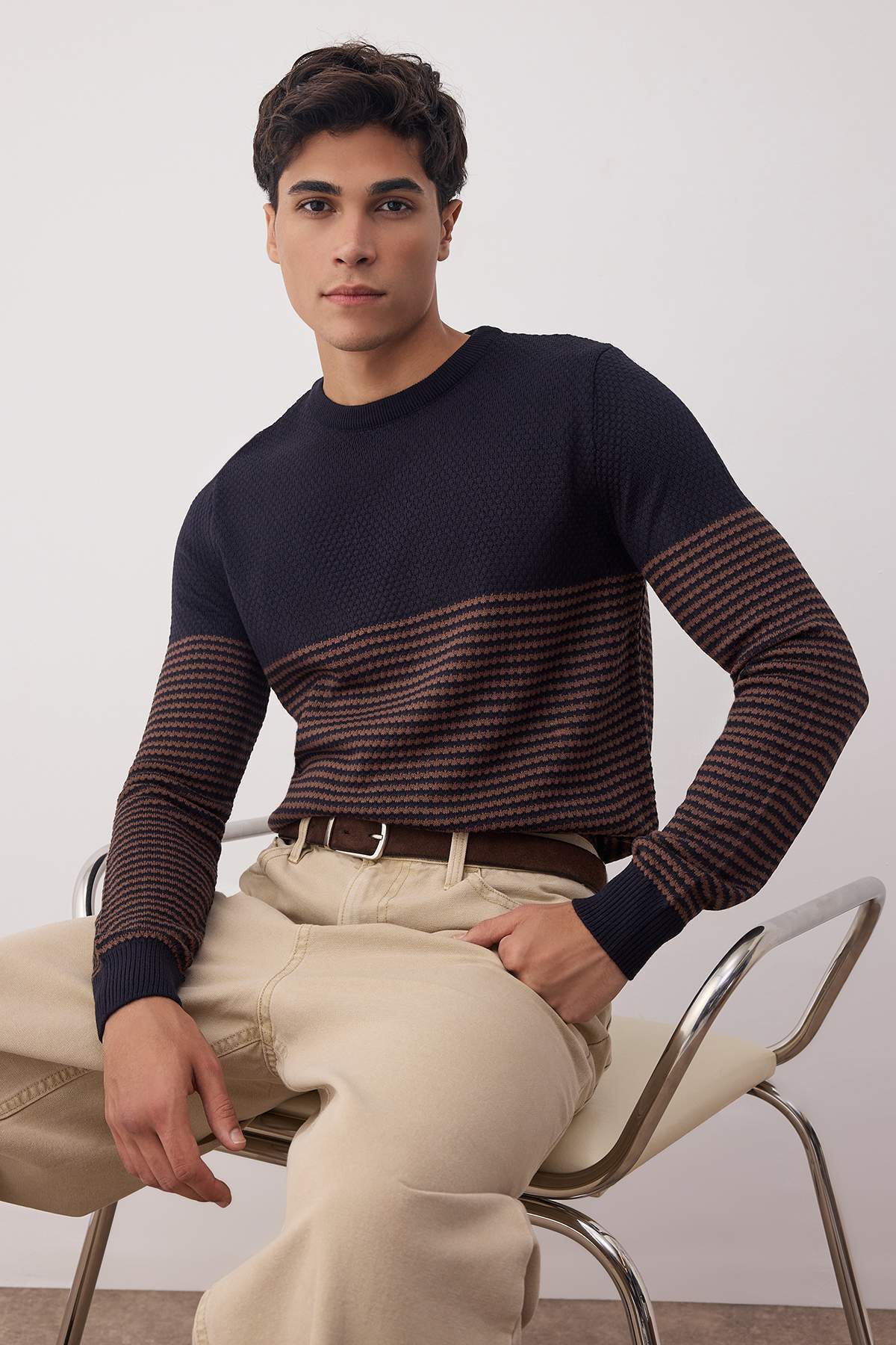 trendyolmilla man lacivert slim fit dar kesim bisiklet yaka cizgili kazak