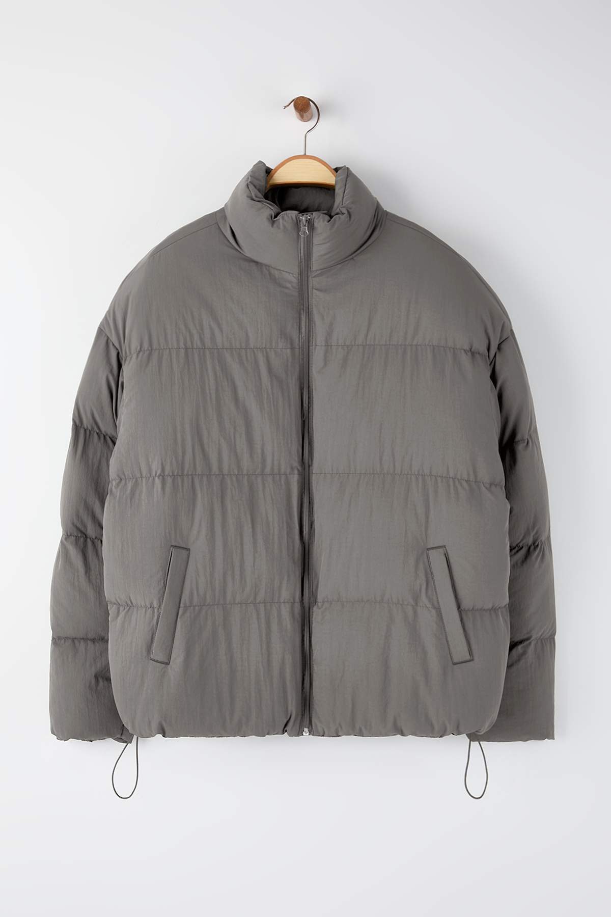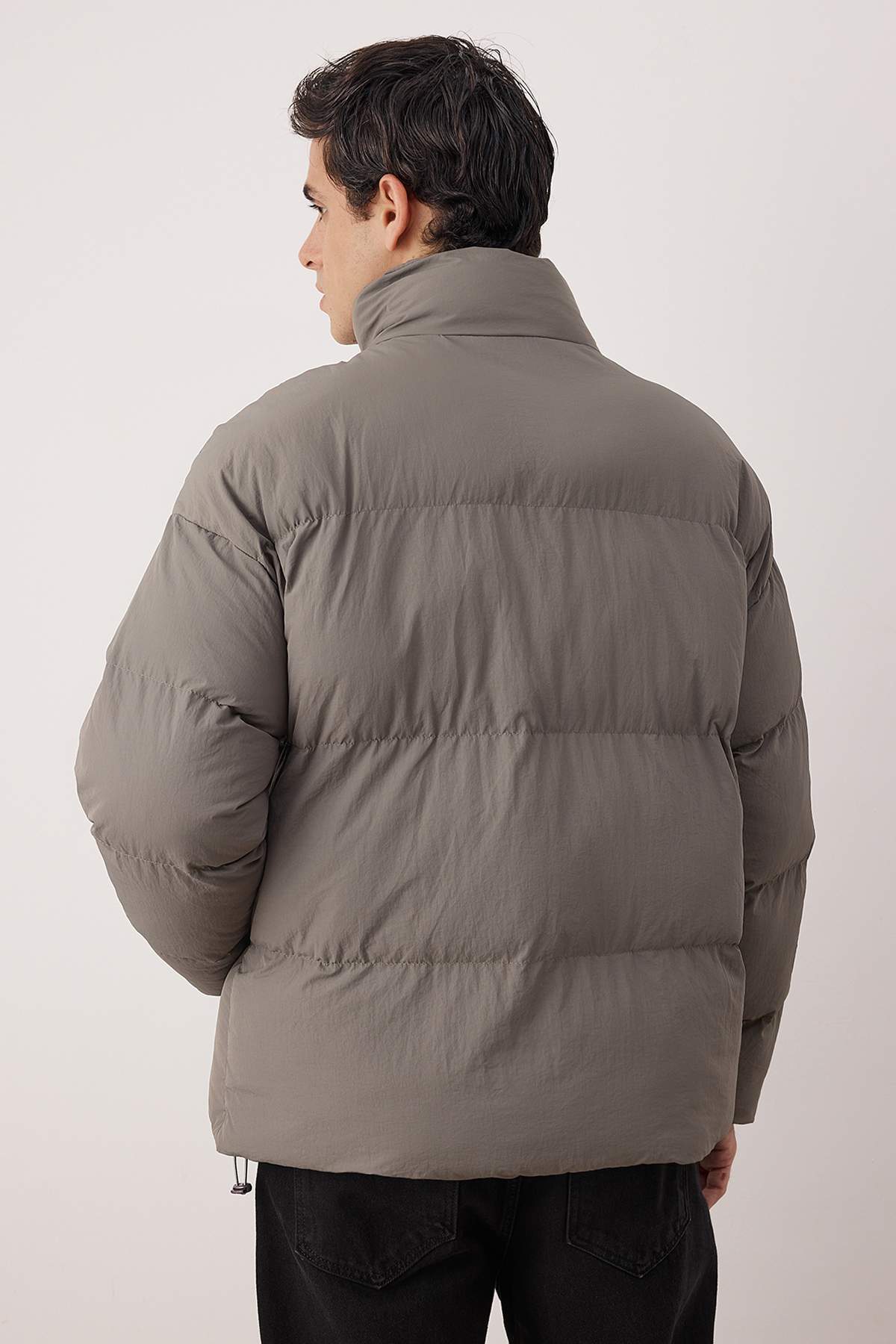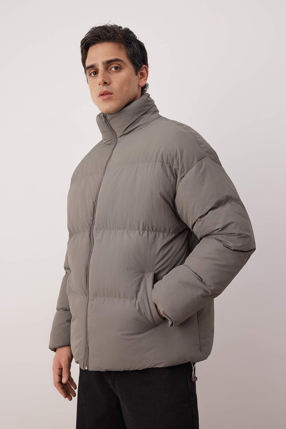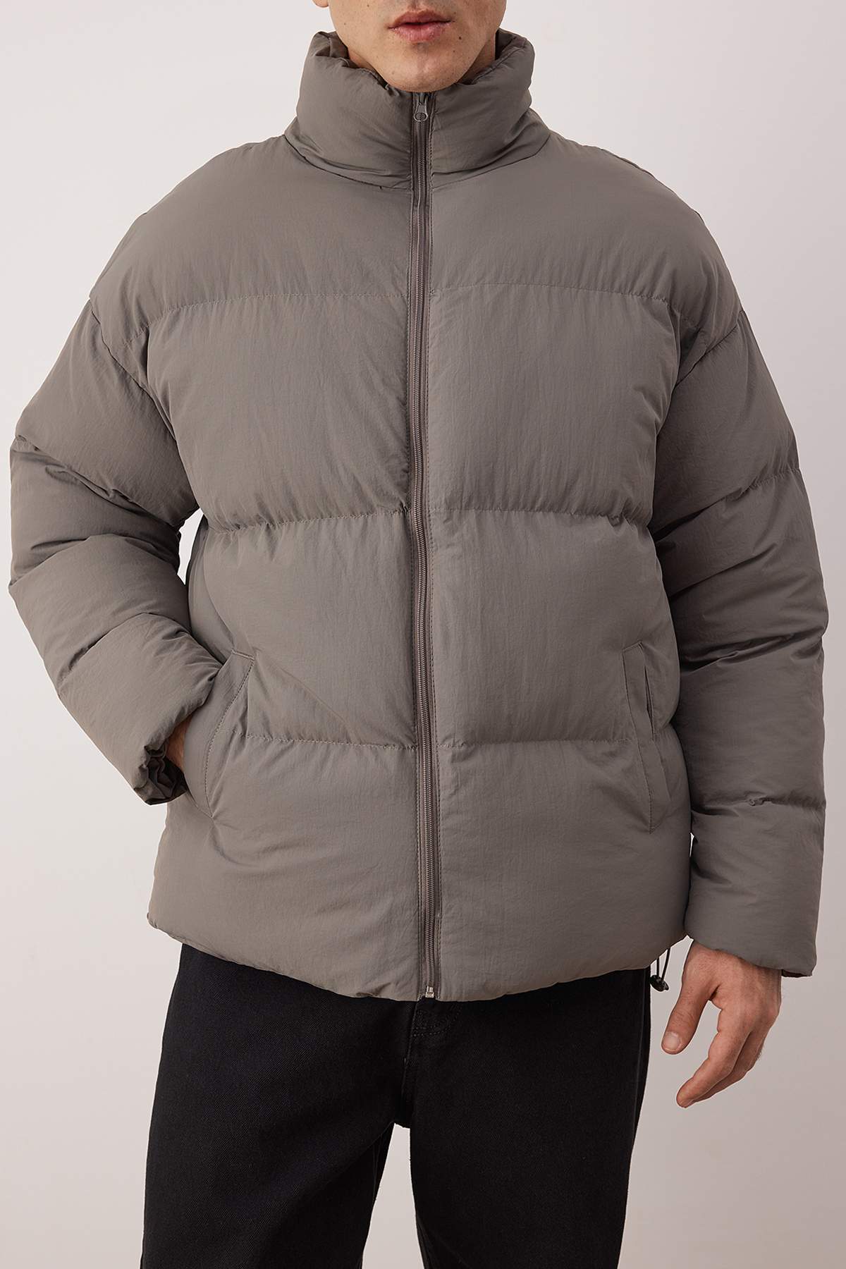 کاپشن زمستانی پفی خاکستری سایز بزرگ، یقه ایستاده، ضد آب و باد Trendyolmilla