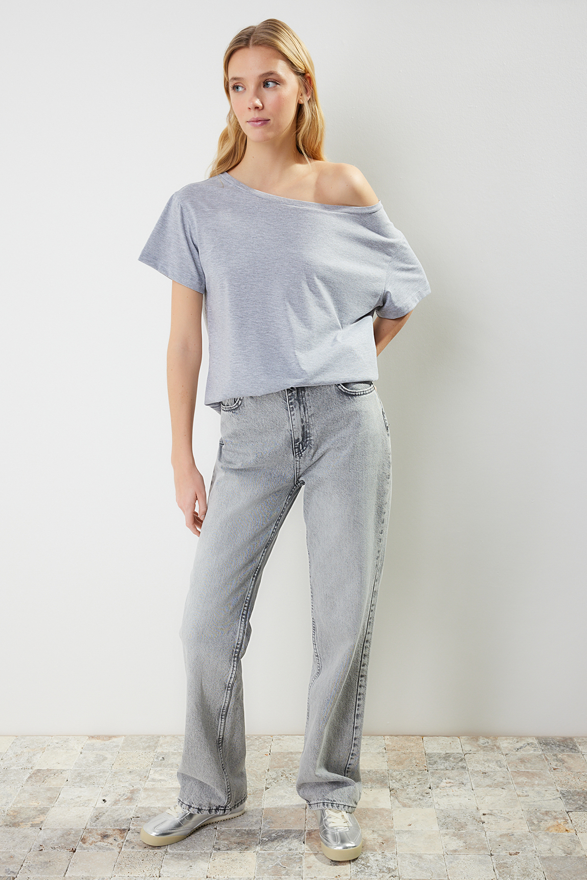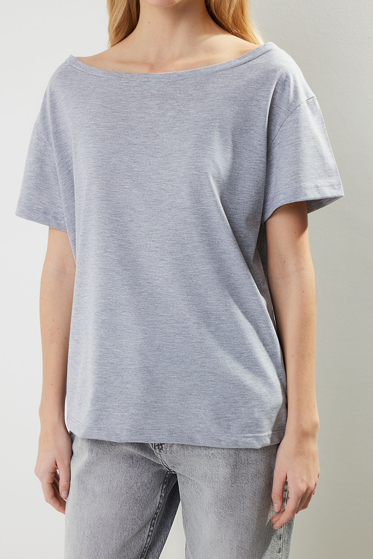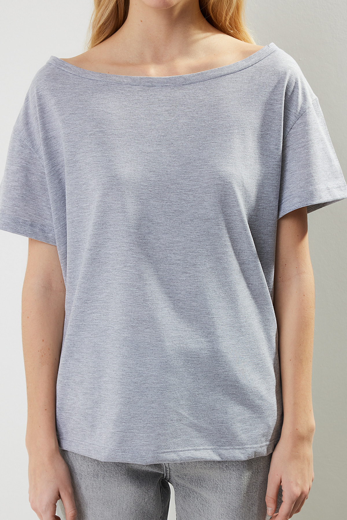 تیشرت زنانه یقه قایقی گشاد/اورسایز 100% پنبه طوسی Trendyolmilla