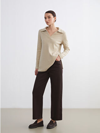 شلوار زنانه دمپا گشاد با اندازه استاندارد از پارچه گاباردین با الیاف پنبهای مرغوب ساخته شده است. این شلوار دارای کمر بلند، پنج جیب و زیپ و دکمه است.