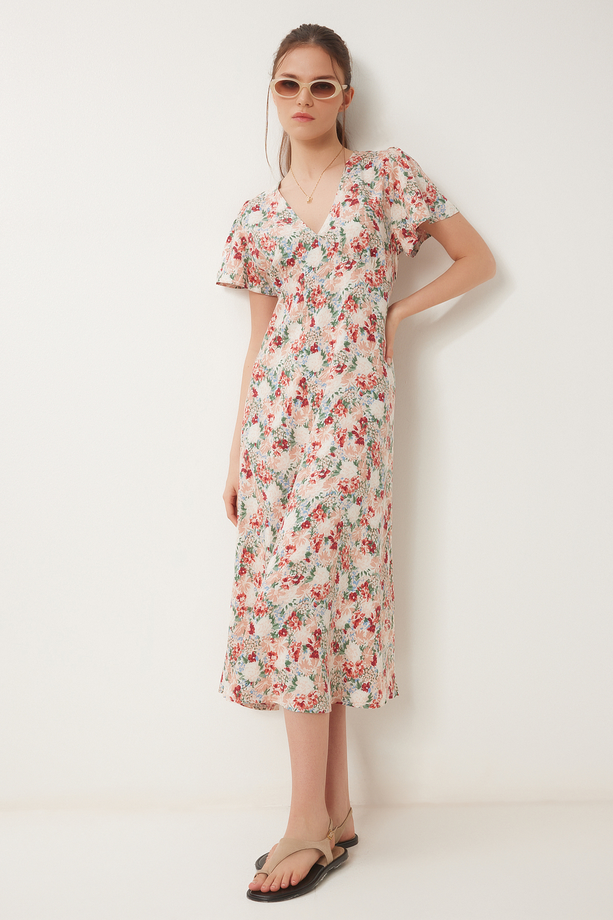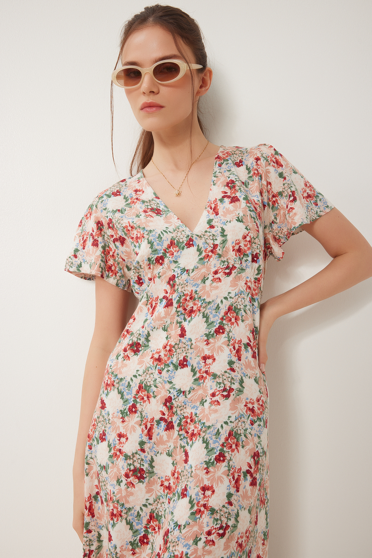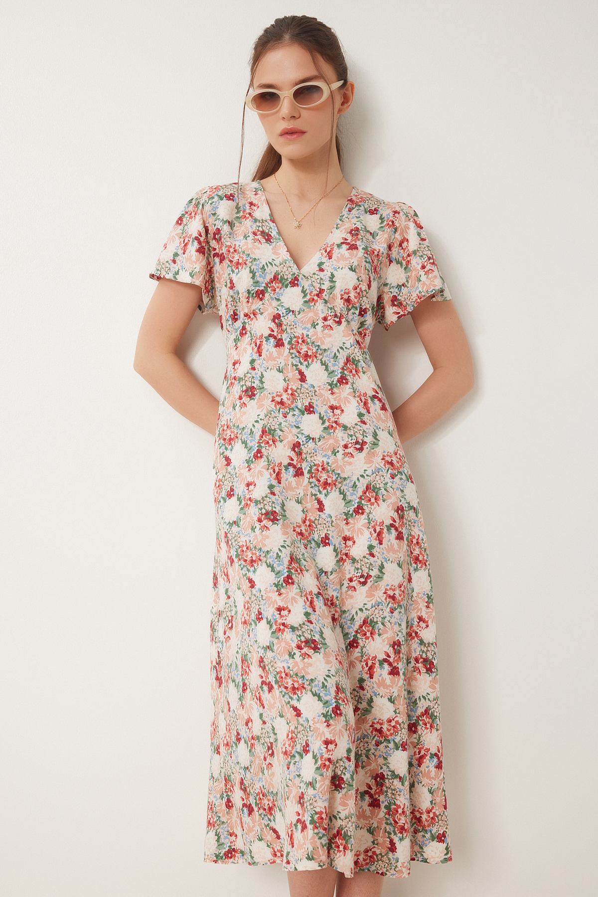 لباس زنانه تابستانی ویسکوز با طرح کاشی و گلهای کرم Happiness Istanbul