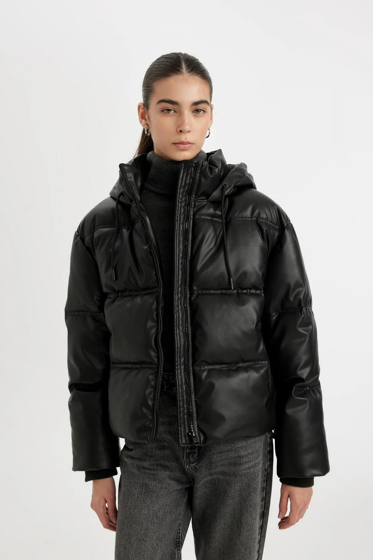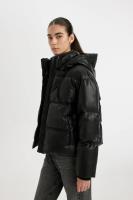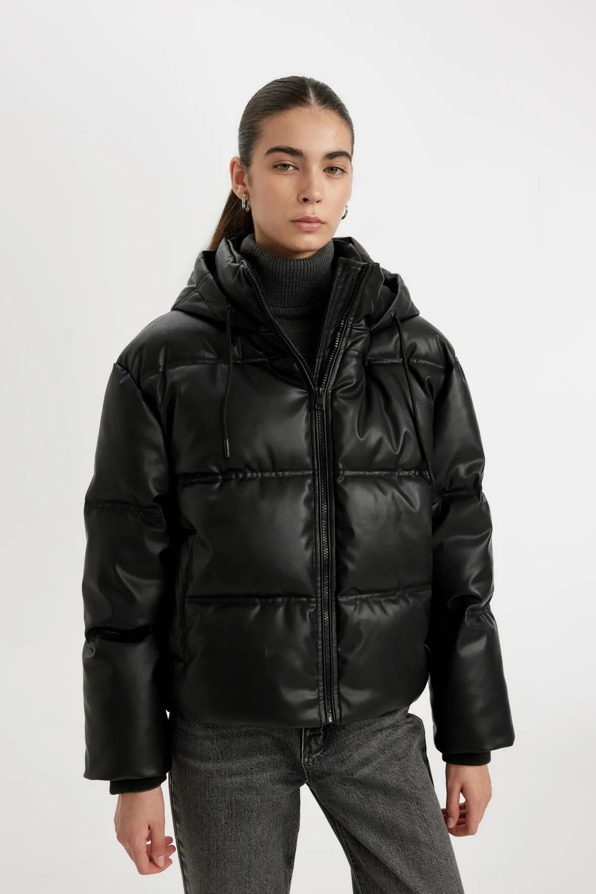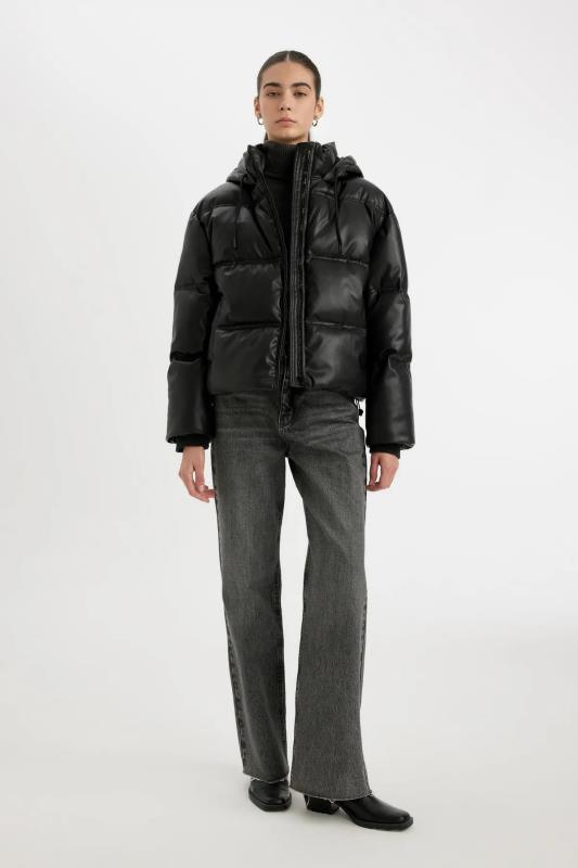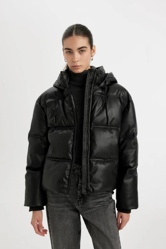 صفحه اصلی\همه کاپشن ها\کاپشن چرم مصنوعی دافع آب با جیب زیپ دار از جنس پشم کلاهدار Defacto مشکی